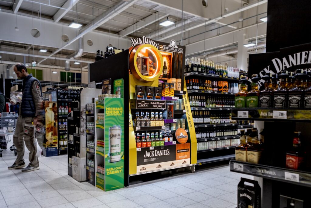 Realization of a combined display for the brands Jack Daniel’s & Diplomático under the banner of Brown-Forman Czechia represents a new trend in the field of shelf ends and endcaps. Compared to traditional permanent solutions costing tens of thousands of crowns, it brings a combination of strong visual impact, functional variability, and a significantly lower price—thanks to the innovative use of FSC-certified cardboard and environmentally friendly water-based printing.