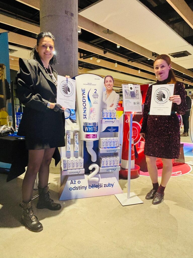 Významný úspěch zaznamenalo také půlpaletové vystavení Sensodyne Clinical White, které obdrželo rovnou dvě ocenění – 1. místo v kategorii Péče o zdraví a zároveň i prestižní Cenu za kreativitu. Porota ocenila čistý, prémiový design, ikonický úsměv zubní lékařky i netradiční 3D prvek – realisticky vytlačenou pastu z tuby, která se proměňuje ve výraznou číslici „2“ a plní roli silného komunikačního nosiče v dolní části stojanu. Efektní symbolika úzce propojuje produkt s benefitní message a výrazně podporuje zapamatovatelnost vystavení.