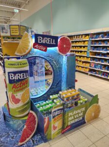 U novinkové řady Birell Active jsme se zaměřili na přenesení svěžesti, hravosti a vitality přímo na prodejní plochu. Hero variantou vystavení je příchuť Pomelo & Grep s kofeinem, která díky své výrazné barevnosti udává tón celému designu. Dominantním prvkem jsou vodní LED tubusy s bublinkami, které přitahují pozornost a evokují okamžité osvěžení. Tyto dynamické prvky jsme doplnili o obří plechovku, která vystavení korunuje nejen jako brandingový prvek, ale i jako praktický produktový stojan. Celková vizualita, citrusové motivy a práce se světlem i pohybem vytváří vystavení, které působí na více smyslů najednou. A stejně jako samotný produkt – i POP médium Birell Active nabízí osvěžení s něčím „navíc“.